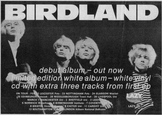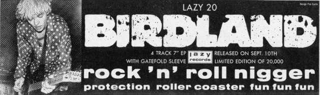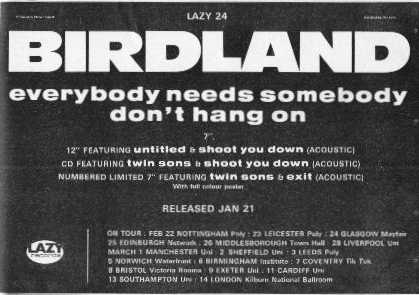 'Rock 'N' Roll Nigger' was, at best, a stop-gap release prior to the eventual release of an album. Backed by three new tracks, the single made the national Top 40 despite - unsuprisingly - no radio support. As one media commentator highlighted, Birdland were able to release their version of the controversial Patti Smith song without needing to take the responsibility for writing it. In the end, the media fury never ignited and the recording paled beside the live version. A bootleg collection of out-takes, demos and live material - 'Kamikaze Kids' - appeared in some major record stores towards the end of the year. Distributors Greyhound are threatened by Lazy but there were whispers that the band, unhappy with Lazy, passed tapes onto those involved in pressing the unauthorised album. Meanwhile, the band spend the last few months of the year finally putting down tracks for a debut album, bringing in Philip Tennant to oversee production. The first fruits of this collaboration is heard in the New Year when the band's final single. 'Everybody Needs Somebody' is released. John Peel was disappointed, calling it "Birdland by numbers" on Radio 1's review show and to an extent this was true. However, like 'Wanted' before it, it was Birdland doing what they did best: short, sharp and punchy and, on the evidence of the extra tracks on this and the previous EP, the band had the beginnings of the more mature sound they clearly wanted but struggled to deliver for the album. When the album finally emerged, the disappointment was palpable. 'Birdand' is not a 'bad' album, and the years are generous, but it never rises much above a 6/10. Too often it was possible to hear blatant lifts rather than honest tribute (Stone Roses, Echo & The Bunnymen, 'Needles and Pins', Television) while even the new version of 'Sleep With Me' saw the band swap the original pop thrill for some kind of tired authenticity. Tired of the cartoon jibes, Birdland had tried to make the difficult third album instead of capturing their early ebbuliance. The CD version includes re-recorded versions of 'Paradise' and 'White' that aren't listed on the sleeve as well as the a-side of the debut EP which only made for a quite bizarre and disjointed listening experience. Arguably, The Strokes made a better Birdland album than Birdland did, only a dozen years after the fact. Press reception to the album was also muted. Simon Williams in the NME highlighted the debt so many of the new tracks owed to other songs before damningly claiming that "... Birdland may have the image, but Mega City 4 have infinitely more sophisticated musical muscle. ... 6/10." Sounds could only award 2/5: " ... (the LP) contains moments of impressive, often polished pop trash. ... (but) song differentiation, as ever, remains Birdland's big problem. Tuneless workouts like 'Don't Look Back', 'Wake Up Dreaming' and 'She Belongs To Me' are practically indistinguishable." The album is supported by a session for the Mark Goodier show on Radio 1 where they played 'She Belongs To Me' / 'Exit' / 'Wake Up Dreaming' / 'Letter You Know'. A trip to Japan in May was, arguably, the band's last great hurrah. One gig was filmed for the TV show Space Shower TV as part of a Birdland special, which also featured an interview with the band and screenings of three of their videos. They look rough and largely disinterested, although this may be down to the demands of Japanese TV.